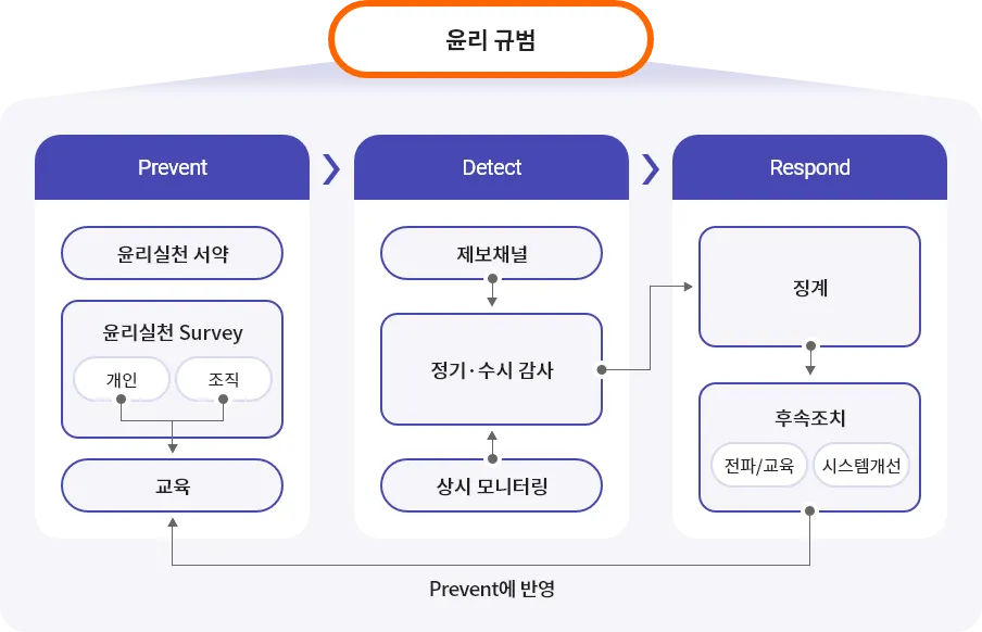 SK하이닉스는 효과적인 윤리경영 실행을 위해 ①Prevent(사전 예방), ②Detect(모니터링 및 감지), ③Respond(사후조치 및 재발방지)의 3단계로 구성된 윤리경영 체계를 운영 중입니다.